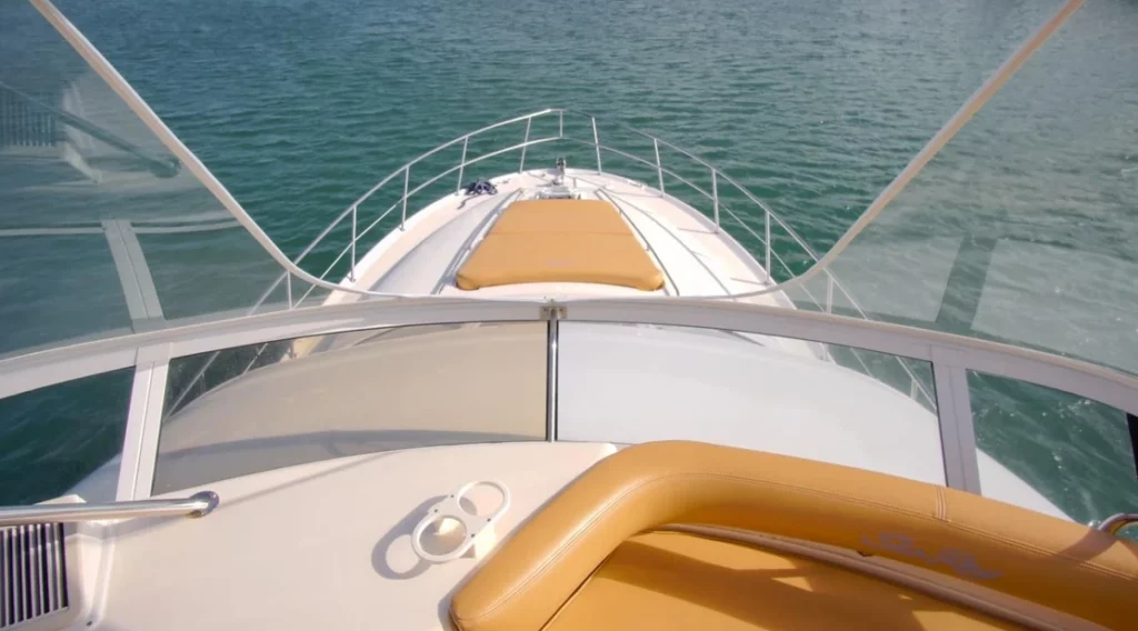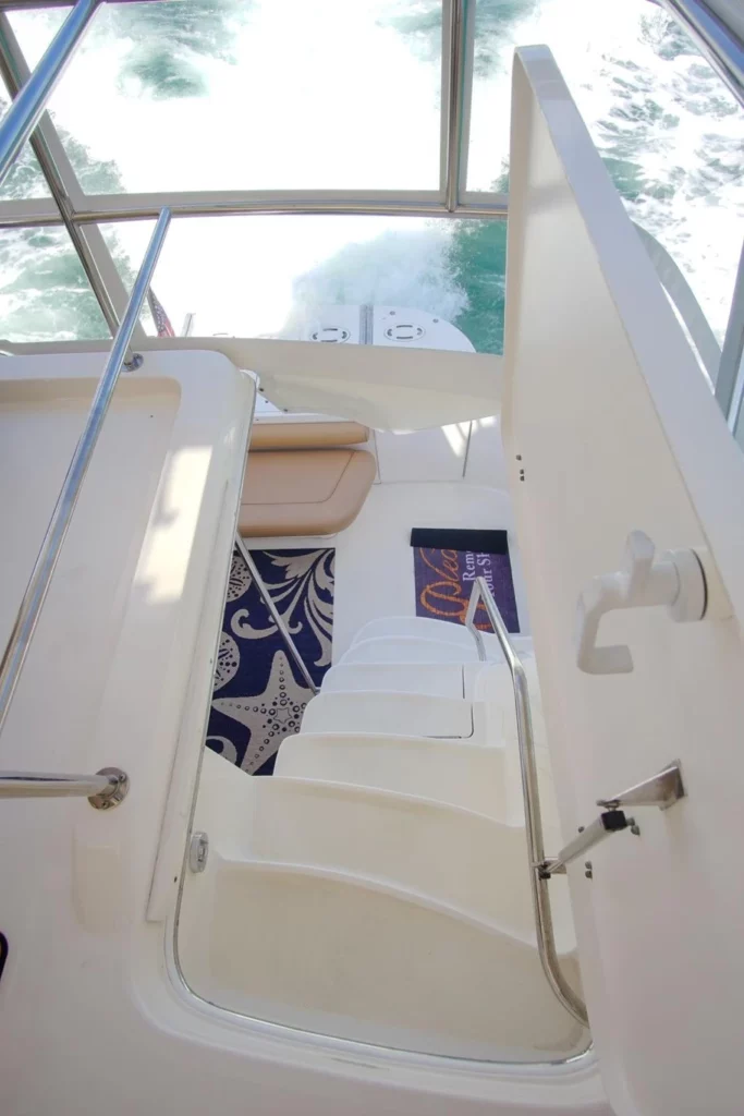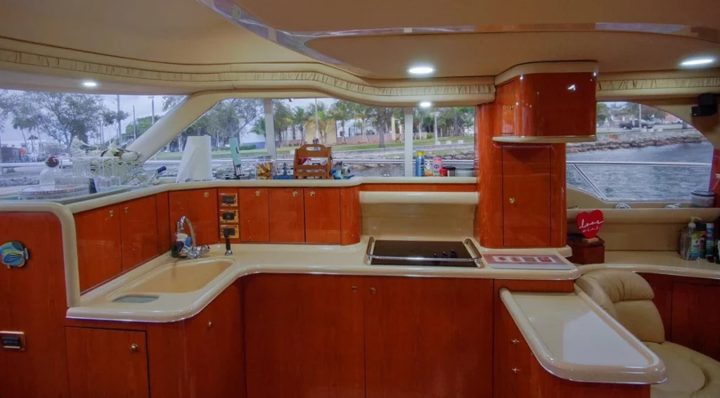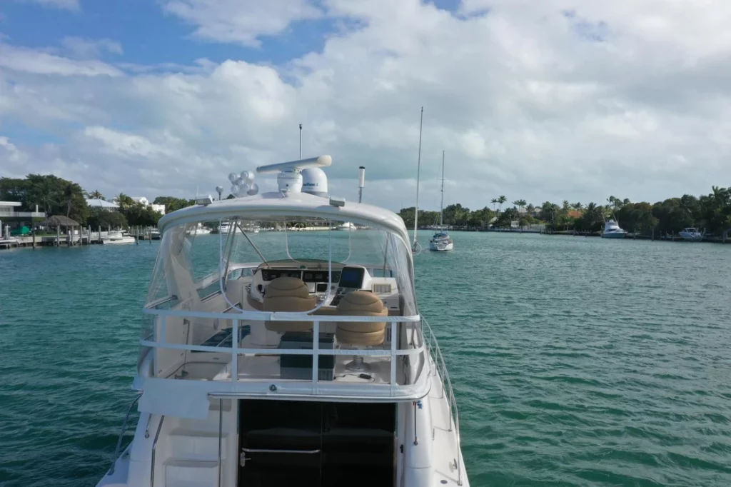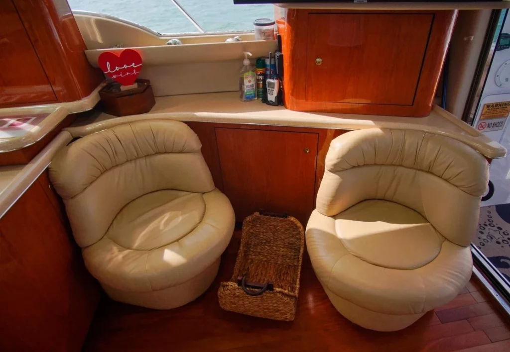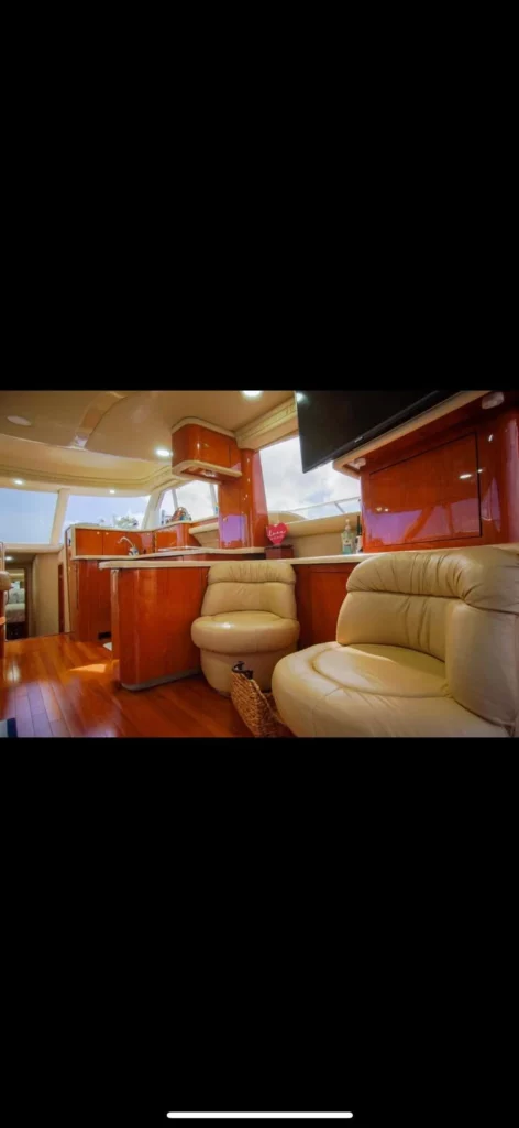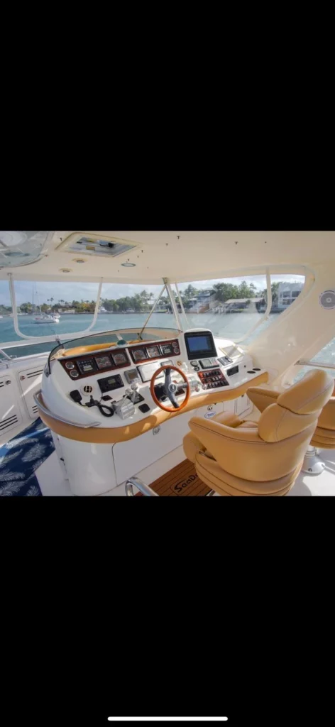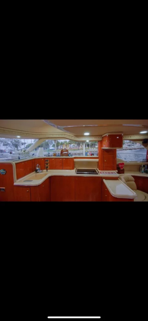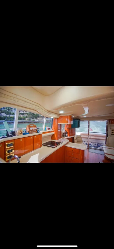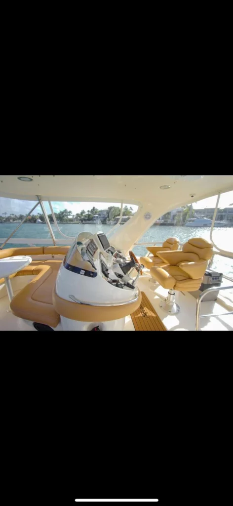 Furnished with factory Sea Ray vinyl really makes you appreciate the detail put into the design of this boat. The galley is modest having a nice hard top stove and sink. The cockpit area of the boat can accommodate to multiple guests with plenty of room. located in the flybridge there is a helm where you may also drive the vessel. Includes bow thruster and auto pilot control making it very easy to operate the yacht.