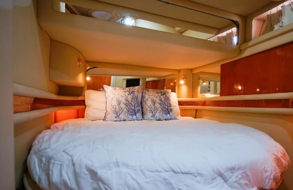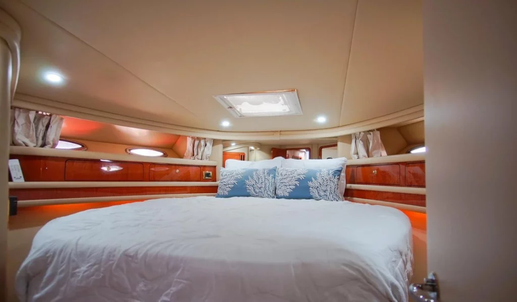 The Sea Ray 480 Sedan Bridge features twin, 640-horsepower Caterpillar engines. The interior of the boat includes three private staterooms, two full heads, two entertainment centers, and sleeping accommodations for many people.