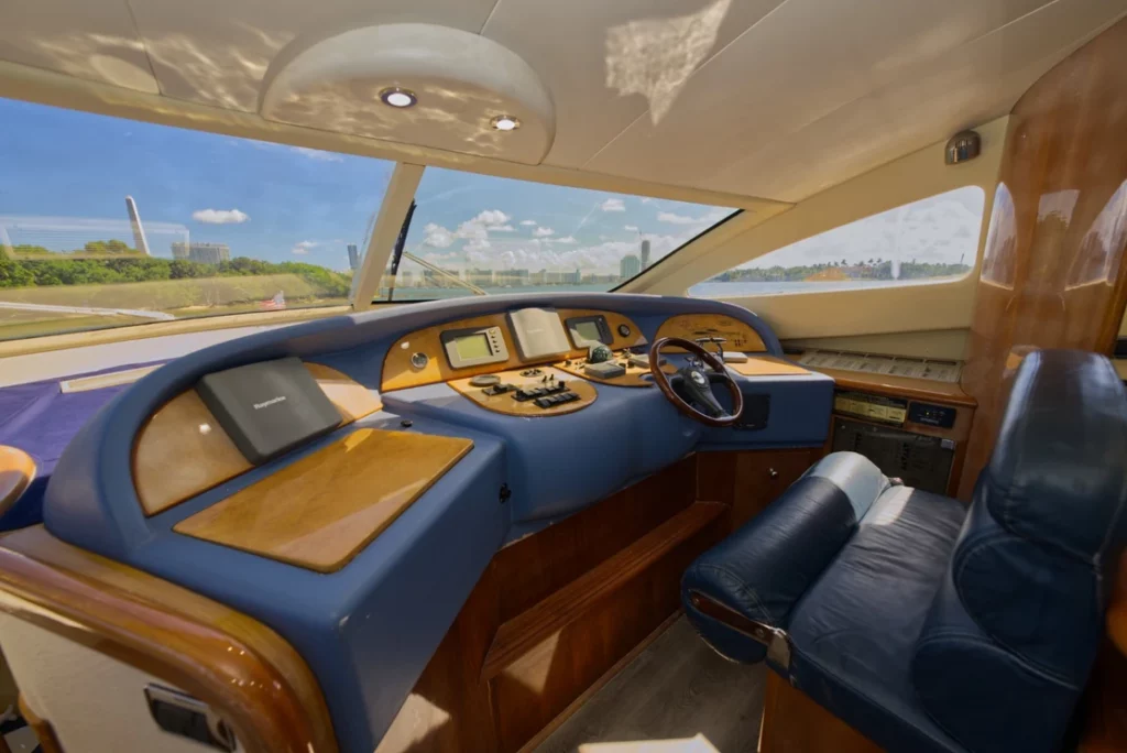 Helm station 1- Blue captains chair- Ray marine electronics- Caterpillar engine controls- Electric engine control- Blue helm station upholstery- Compass- Fuel gauge- Windlass control- Autopilot- Ambient lighting