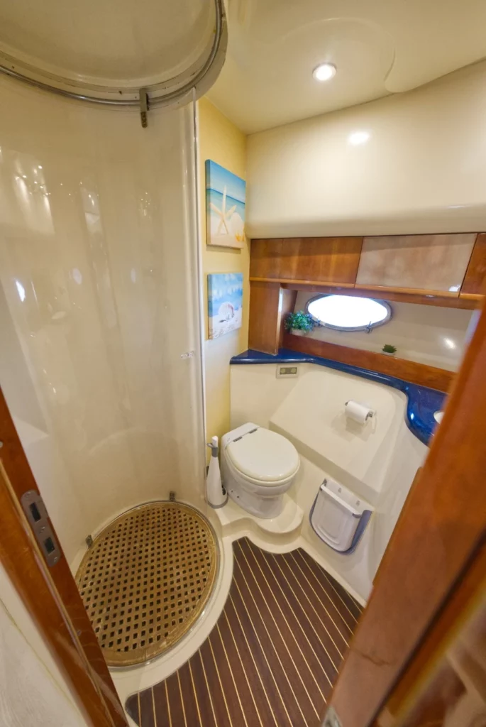 Cockpit:- sea deck flooring- Glass sliding door- Stairs to flybridge- Port and starboard access to bow- Engine room floor latch- Paserelle- Fuse panel control- Crew quarters- Bench seating- Cleats- Entertainment area
