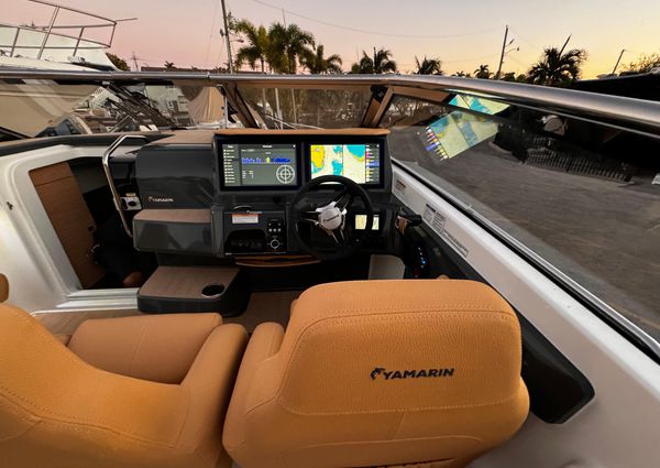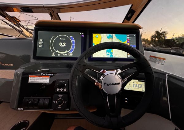 Yamarin 80 DC features a clearly laid-out cockpit, which has been designed with designated places for screens, Yamaha gauges and the joystick that controls the engine, as well as a charging port for phones.