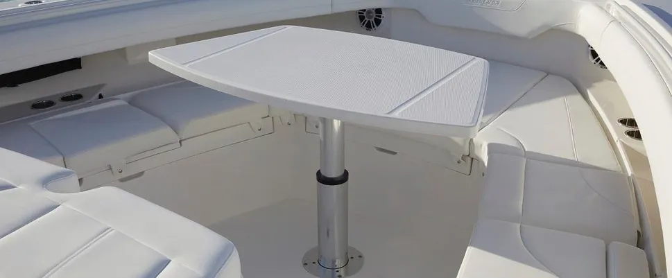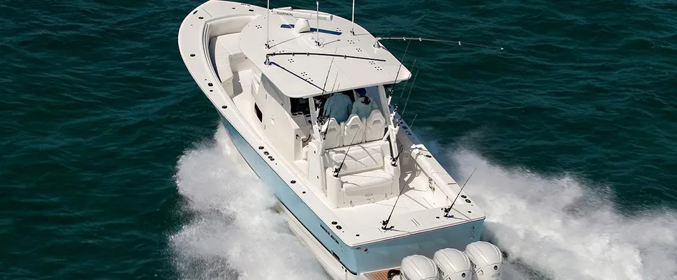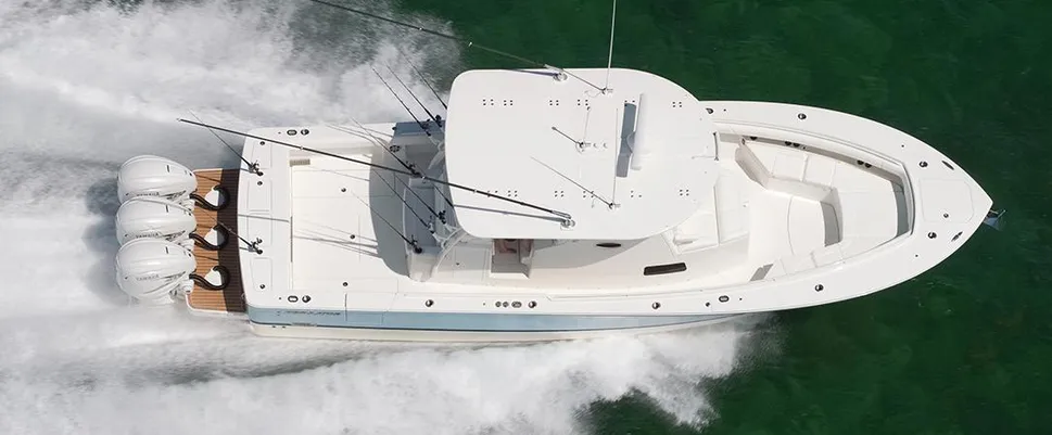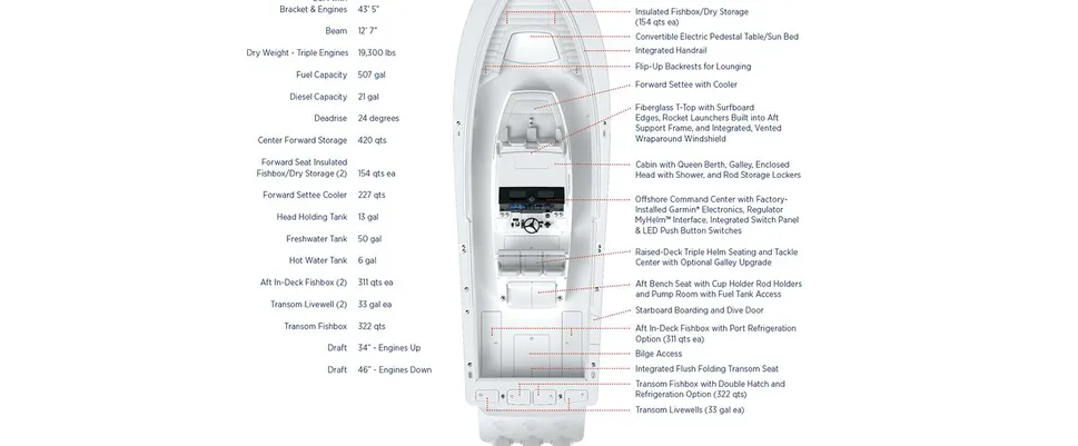 Triple Yamaha XF425s. 507-gallon fuel capacity. Digitally-enhanced helm station. Triple helm seating with aft bench seat and pump room. Optional Tower. Deluxe cabin with queen berth, galley, head and so much more. Our expert engineers and craftsmen have planned every inch of this 43-foot-plus ride to deliver fishability, comfort, and convenience at every turn.