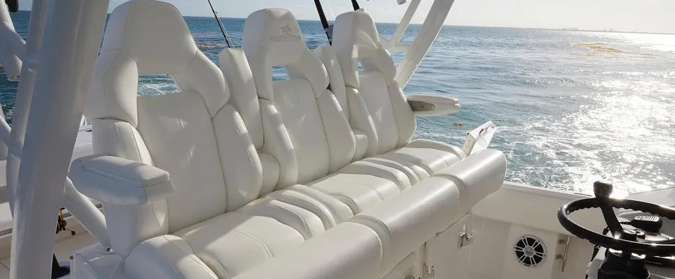 - Regulator E-Series Seating & Tackle Center: Features Raised-Deck, Triple Helm Seating with Armrests, Flip-Up Bolsters, and Individual Folding Footrests with SoftGrip Foot Rail – in addition to Aft-Facing Bench Seat for Two Flanked by Built-In Armrests with Cup Holder Rod Holders, Tackle Storage, (6) Rocket Launchers Built into Aft Support Frame, and Pump Room with Fuel Tank Access