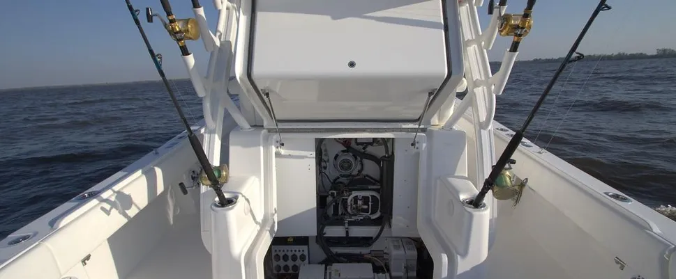 - Illuminated Pump Room Beneath Aft Bench Seat with Easy Access to Fuel Tanks, Optional Seakeeper® 5, & Other Systems, Plus Extra Storage