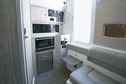 The Offshore Command Center features Garmin® Multi-Function Display with Digital Switching and Monitoring, along with proprietary Regulator MyHelm™ interface to seamlessly and intuitively connect key functions in one application – with wireless key fob to trigger lighting, batteries, and more as you approach or disembark with the touch of a button. The E-Series Seating & Tackle Center features a raised deck with triple helm seating, plenty of tackle storage, and six rocket launchers – plus aft-facing bench seat for two, flanked by built-in armrests with Cup Holder Rod Holders. Opt for E-Series Galley Upgrade with electric grill and refrigerator to entertain with ease. Beneath the bench seat, you’ll find the illuminated pump room with fuel tank access, optional Seakeeper® 5 and other systems, as well as extra storage.