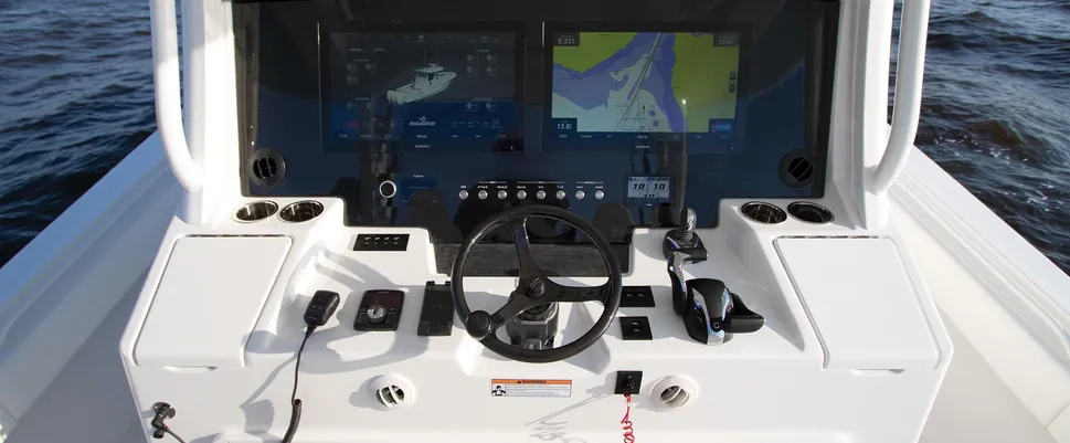 - Offshore Command Center: Features Garmin® Multi-Function Displays with Digital Switching and Monitoring, Proprietary Regulator MyHelm™ Interface for Seamless and Intuitive Connectivity of Key Functions via Touchscreen, and Wireless Key Fob