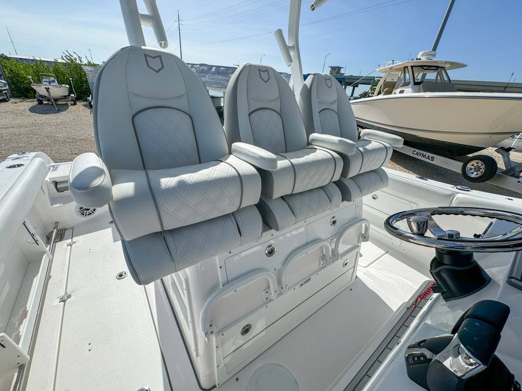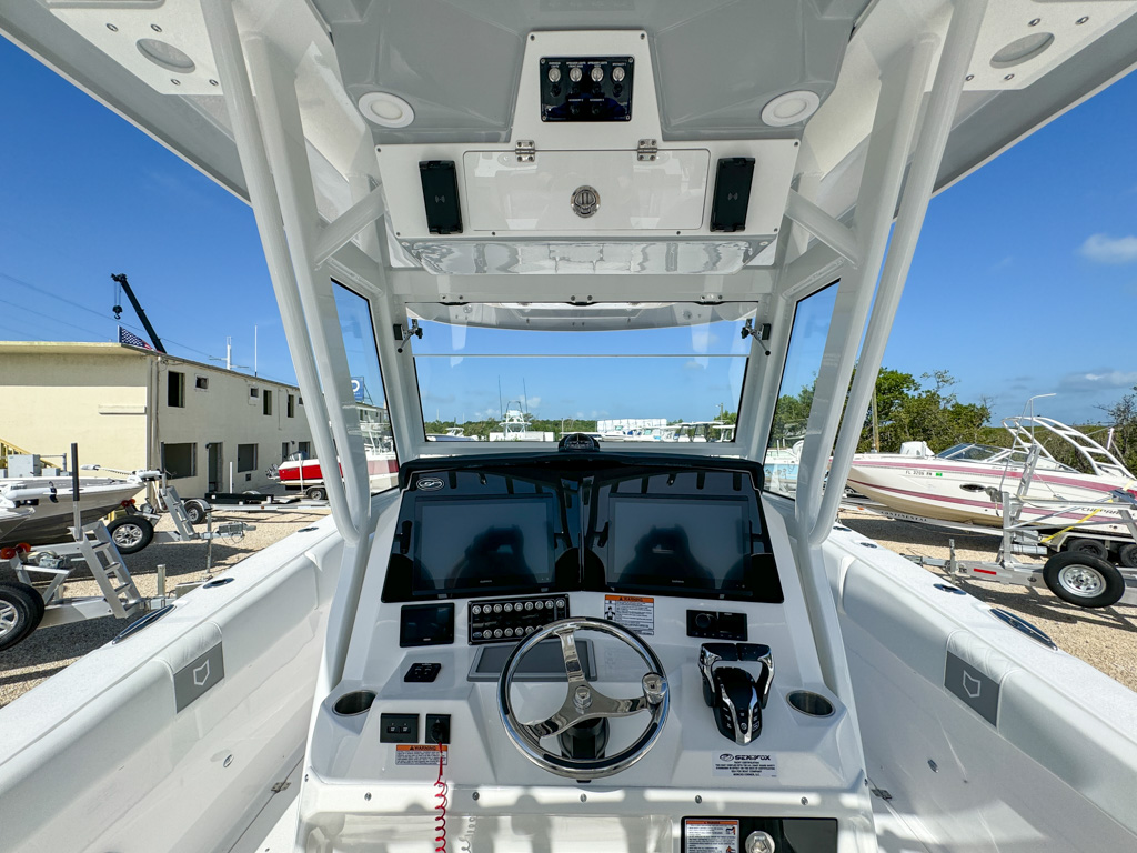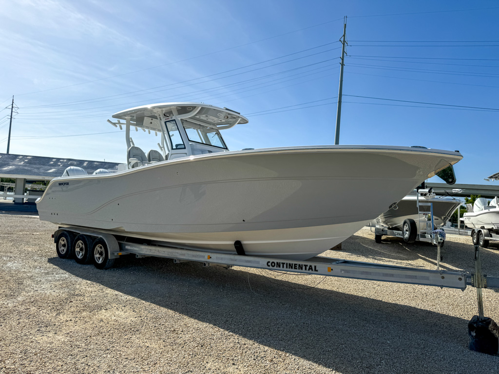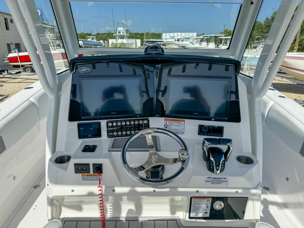 The 2025 Sea Fox 328 Commander is a stunning center console boat that offers the best of both worlds: luxury and fishability. This boat is powered by twin Yamaha F300NSB2 engines which deliver incredible performance and maneuverability. The 328 Commander has a sleek and spacious cockpit, with a fiberglass helm seating pod, deluxe bucket chairs, a rigging station, and a cooler storage. The console features a new integrated windshield for the Ultima fiberglass hardtop with full glass enclosure, which provides protection and visibility. The console also has a Dometic SeaStar Optimus electronic power steering system, a Fusion stereo head unit with JL Audio custom sound system, two Garmin 8616XSV touchscreens, an electric ceramic toilet, and a freshwater sink. The bow area has a windlass anchoring system, curved backrest cushions, a forward console lounger, a removable table, and a casting deck with a filler board. The 328 Commander also has a dive door boarding ladder, a removable ski tow bar, an overboard waste discharge, and a LED/tech package. The 328 Commander is built with a deep V-hull design and high-quality materials, ensuring stability, durability, and a smooth ride. You can choose from various hull colors, upholstery options, and powder coating packages to customize your boat. The 328 Commander is the ultimate boat for fishing, cruising, or entertaining.