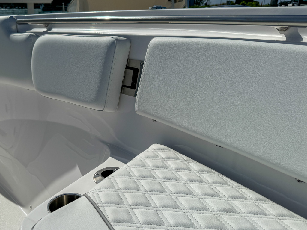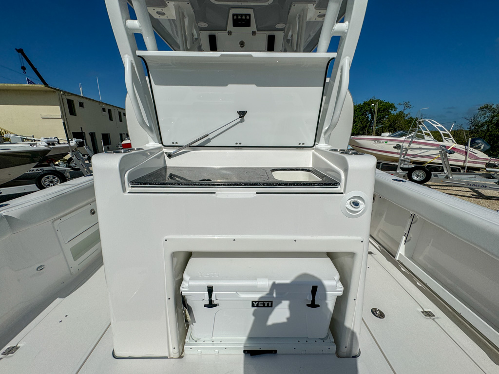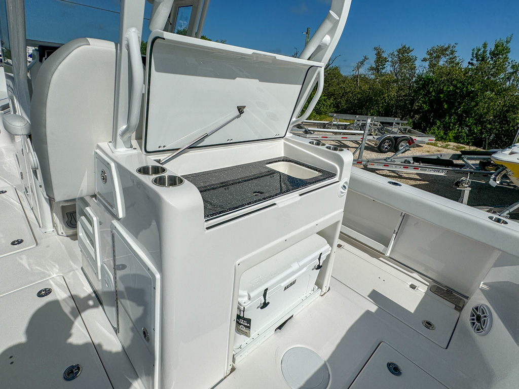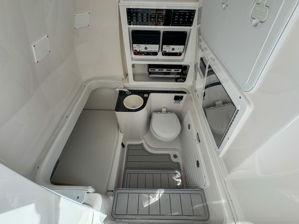 The 2025 Sea Fox 328 Commander is a stunning center console boat that offers the best of both worlds: luxury and fishability. This boat is powered by twin Yamaha F300NSB2 engines which deliver incredible performance and maneuverability. The 328 Commander has a sleek and spacious cockpit, with a fiberglass helm seating pod, deluxe bucket chairs, a rigging station, and a cooler storage. The console features a new integrated windshield for the Ultima fiberglass hardtop with full glass enclosure, which provides protection and visibility. The console also has a Dometic SeaStar Optimus electronic power steering system, a Fusion stereo head unit with JL Audio custom sound system, two Garmin 8616XSV touchscreens, an electric ceramic toilet, and a freshwater sink. The bow area has a windlass anchoring system, curved backrest cushions, a forward console lounger, a removable table, and a casting deck with a filler board. The 328 Commander also has a dive door boarding ladder, a removable ski tow bar, an overboard waste discharge, and a LED/tech package. The 328 Commander is built with a deep V-hull design and high-quality materials, ensuring stability, durability, and a smooth ride. You can choose from various hull colors, upholstery options, and powder coating packages to customize your boat. The 328 Commander is the ultimate boat for fishing, cruising, or entertaining.